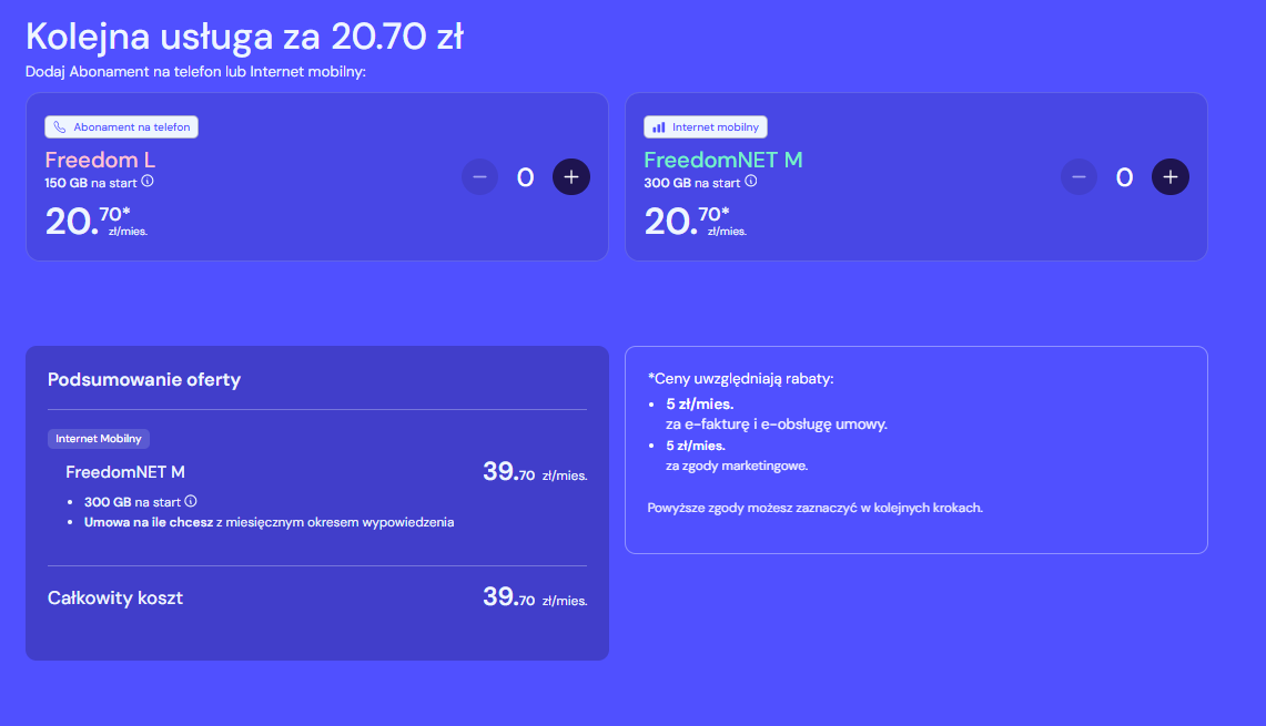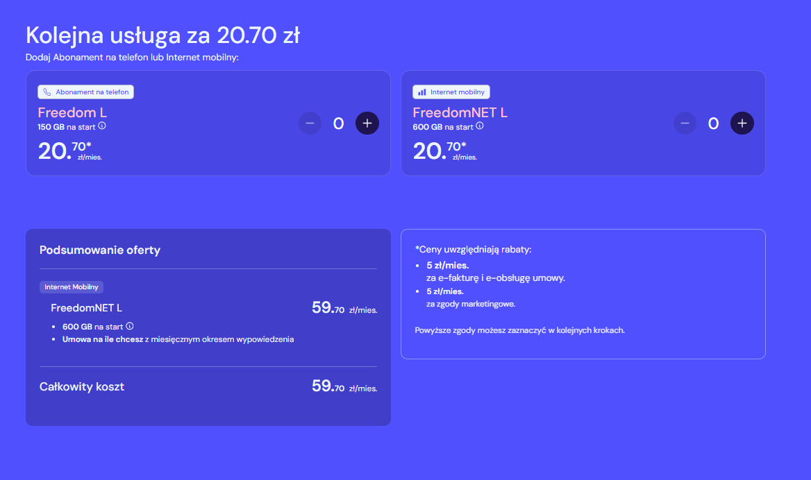 | Freedom L | 39,70 zł/mies. | 20,70 zł/mies. | 60,40 zł/mies. | 30,20 zł/mies. | 19,00 zł/mies. |